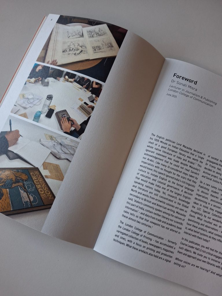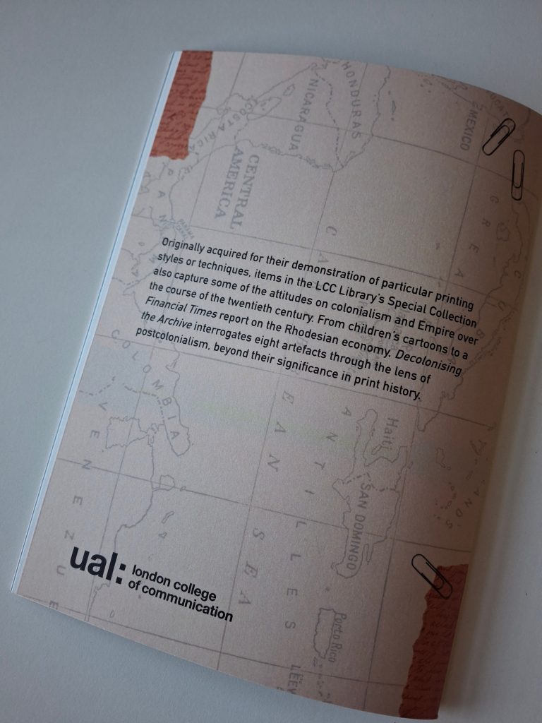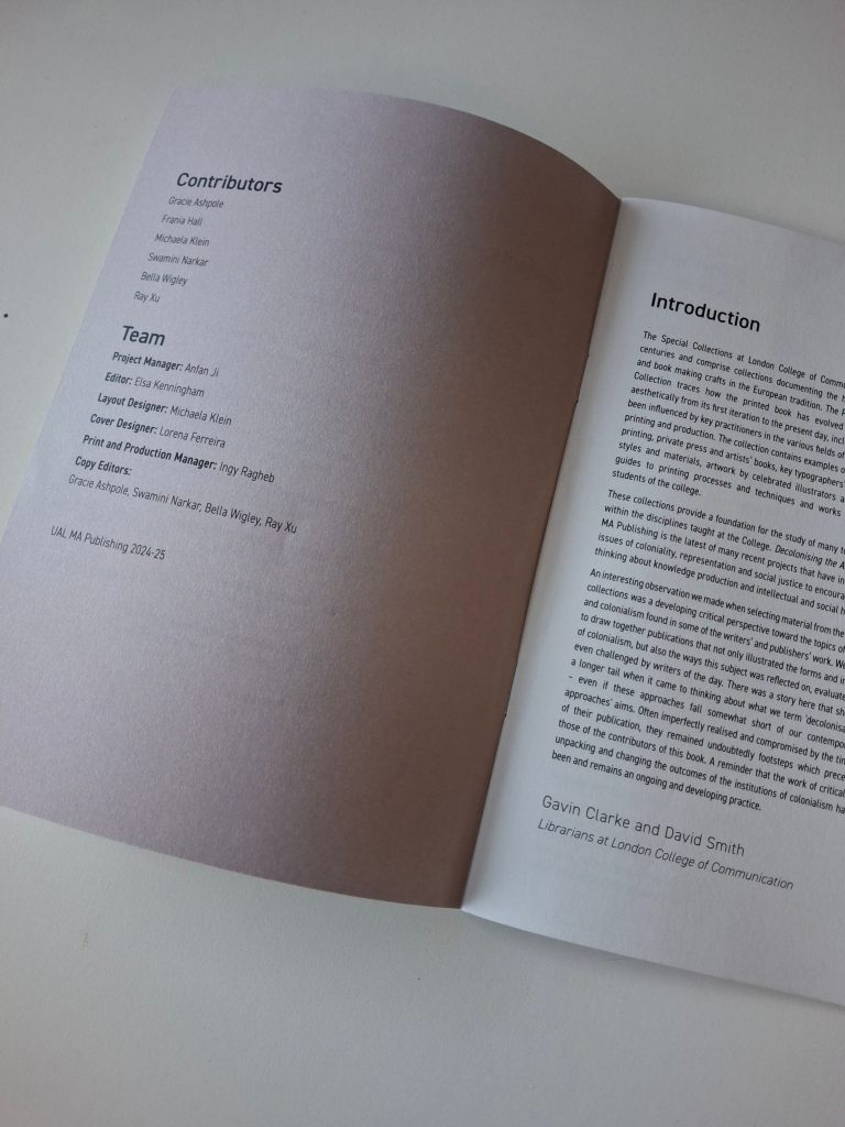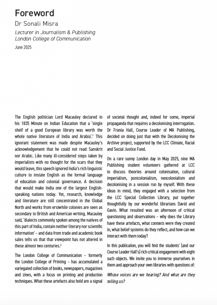 I am a Lecturer on MA Publishing at LCC. My manager received funding from the LCC Climate, Racial and Social Justice Fund to create a student publication on decolonising the LCC Library’s Special Collections and brought me on board to conduct a one-off session. I delivered a session on theories around colonialism, imperialism, hegemony, postcolonialism, neocolonialism, and decolonising, applying them to spheres of literature and publishing. The students used the theories and discussions to foreground their engagement with the chosen archival items to create their publication. I also wrote a foreword for the publication. Images of the publication and my foreword are in the Appendix. More information about the context can be found here.