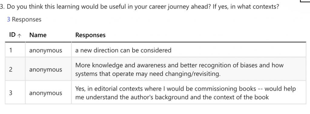 Two students felt this teaching should be embedded in the course, while one was unsure and another said no (latter two didn’t provide a reason). The two saying yes said that it should be embedded in the MA Publishing Context unit (discussed more in Action section). To have more open dialogue and show students the relevance of decoloniality in their student life, I shared some information regarding unconscious bias and Awarding Gaps at British universities (inspired from our IP workshops). One student liked the video excerpt I played about ‘white curriculum’ (UCL 2014). The slides from my session are attached in the Appendix.