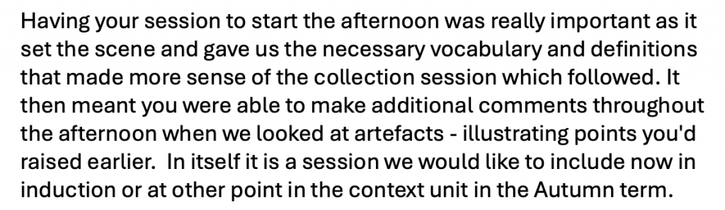 Laura-Beth: ‘Short time for session, broad themes and subjects, maybe ask students to focus one aspect and the present it to the class to show understanding of learning. Is there scope to make something in the course assessment specifically focus on this i.e a blog post, essay?’